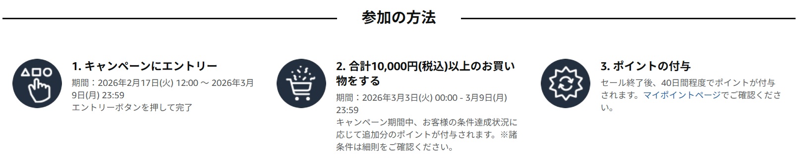 キャンペーンへエントリー後、お買い物対象期間である「1/27 9:00~2/2 23:59」内に10,000円以上のお買い物を行うとポイント還元されます。