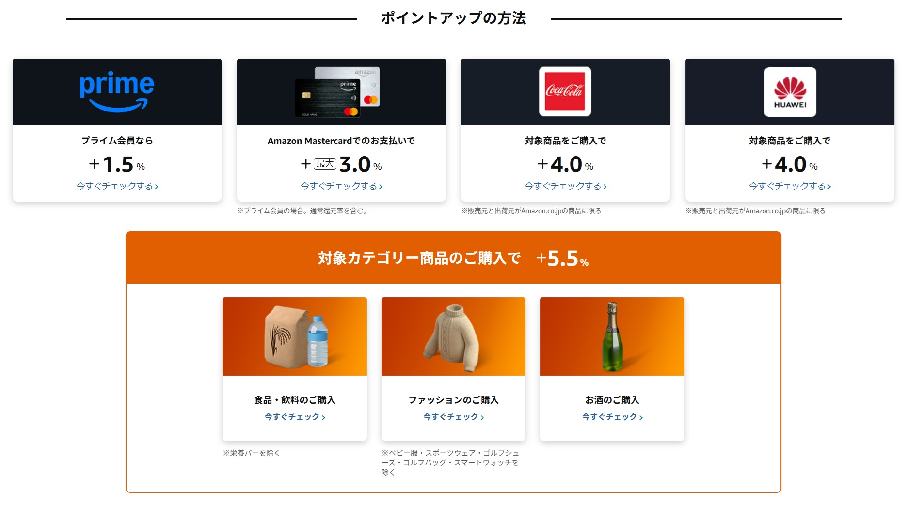 「プライム会員」なら1%、「Amazon Mastercardでのお支払い」なら3.0%のポイントが加算されます。