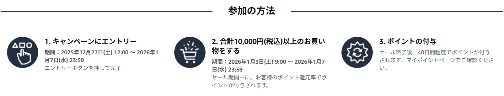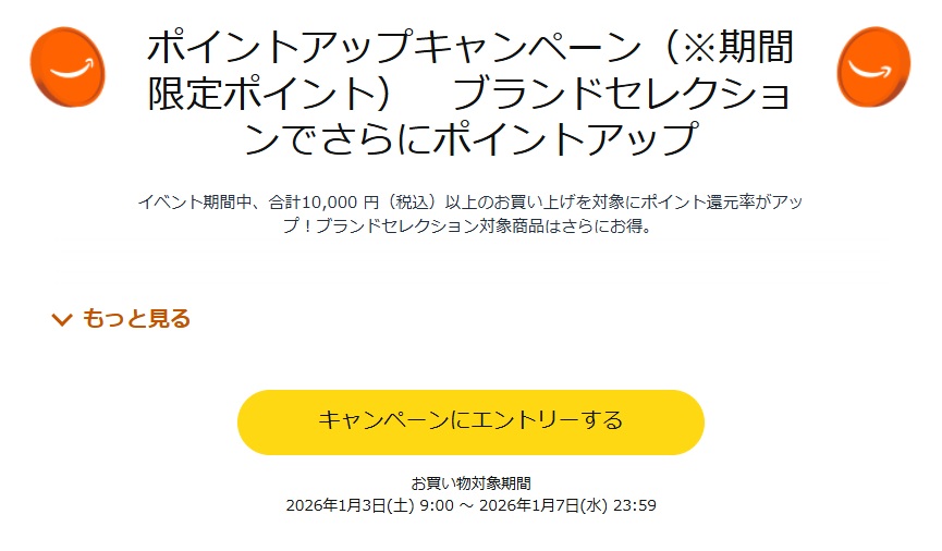 キャンペーンへエントリー後、お買い物対象期間である「1/3 9:00~1/7 23:59」内に10,000円以上のお買い物を行うと、対象に応じたポイント還元されます。