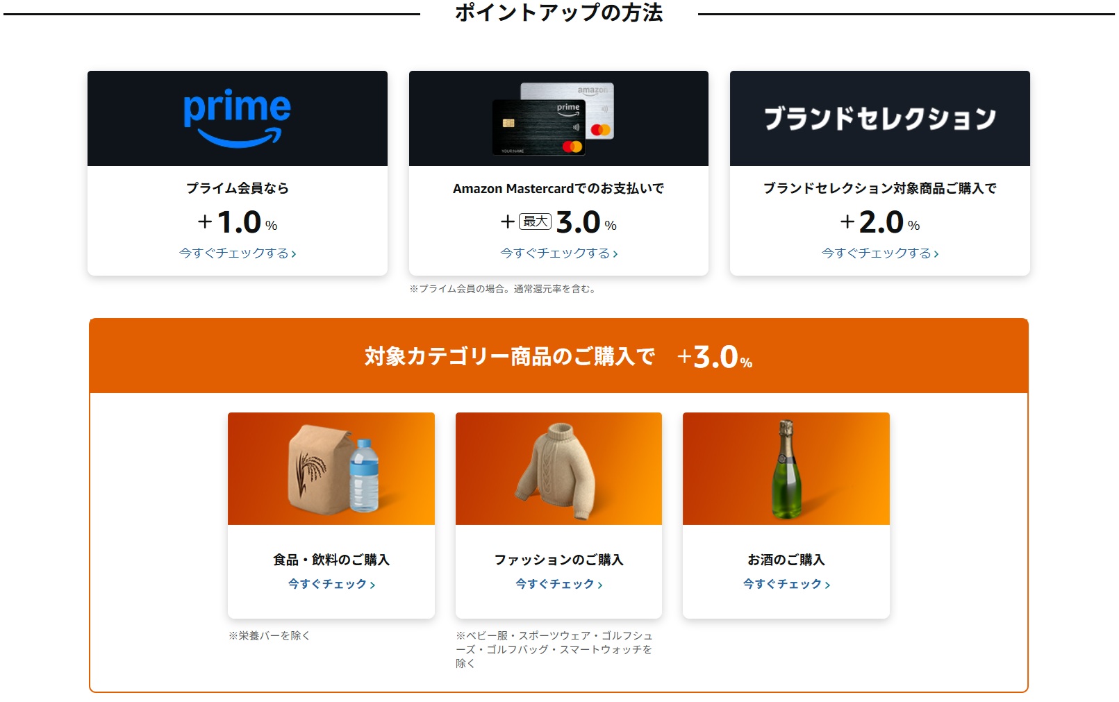 「プライム会員」なら1.0%、「Amazon Mastercardでのお支払い」なら3.0%、「ブランドセレクション対象商品の購入」で2.0%、ポイントが加算されます。