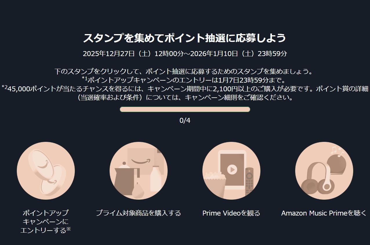 「プライム会員の方」や「この機会にプライム会員になられた方」は、是非「プライムスタンプラリー」にエントリーしましょう!