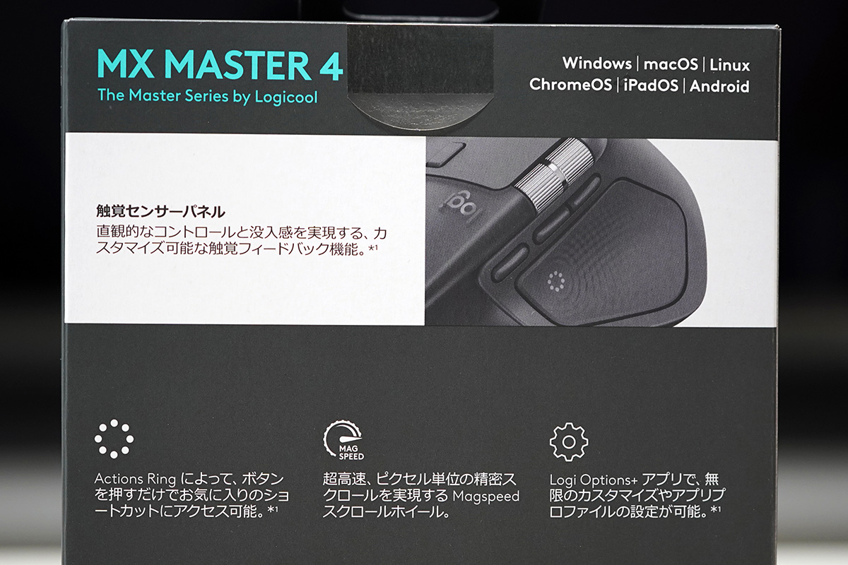 パッケージ表面には大きくマウス本体がプリントされており、右上には新機能である「触覚フィードバック」のアイコンが輝いています。